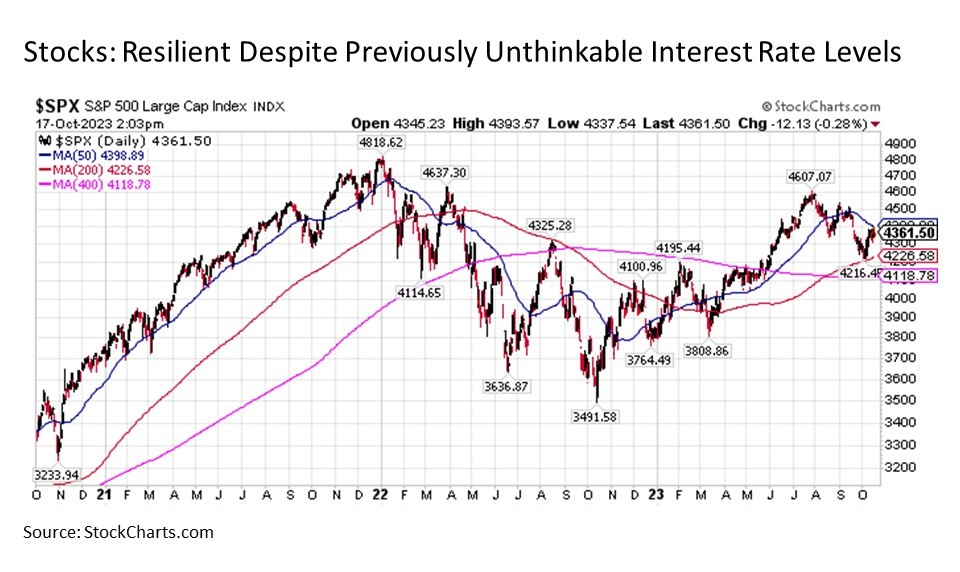 In short, despite all of the challenges currently pressuring stock prices, it is worthwhile to consider how well U.S. stocks have held up over the last couple of years in what were previously unthinkable market conditions as recently as a couple of years ago.  Despite all of the threats, stocks are still within striking distance of new all-time highs.