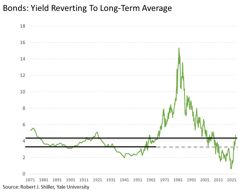 While the 10-Year U.S. Treasury yield pushing north of 5% seems unimaginable but recent standards, it is important to put today’s rates into historical context.  While the move in Treasuries has been sharp over such a short period of time, the net result has been yields essentially reverting back to their 150-year long-term average at 4.5%.  Moreover, what was more of the outlier is the fact that Treasury yields were so low for such a prolonged period in the 2010s and early 2020s, not that they are as high as they are today.