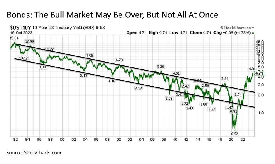 Bond views.  Stocks are not the only major asset class that has seen their share of recent difficulties.  The largest outbreak of inflation since the 1970s sent bond yields soaring in 2022.  And following a brief respite in the first part of 2023, yields have since surged to new cycle highs.