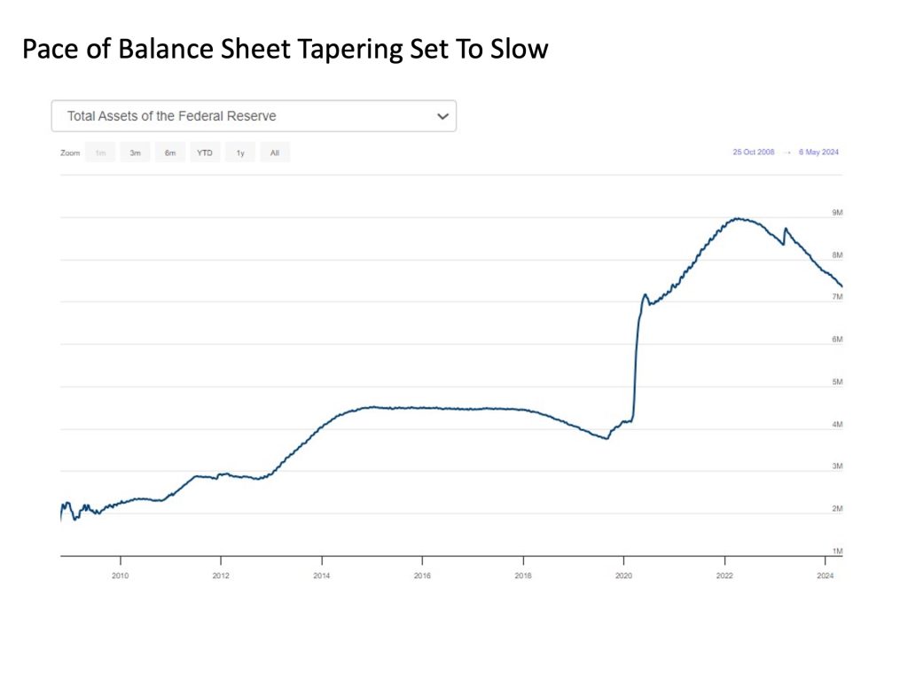 Refreshing liquidity. Amid widespread signs of already abundant liquidity, the U.S. Federal Reserve is set to give the market an added boost as the summer gets underway. The Fed has already lopped more than $1.2 trillion in total assets from its balance sheet since 2022 (nearly $9 trillion to $7.8 trillion), and U.S. stocks have hardly noticed. And starting in June, the Fed will slow the pace of its balance sheet reduction from $95 billion to $60 billion per month. The reduction will come from scaling back the roll off in U.S. Treasuries from maturities not being replaced from $60 billion to $25 billion per month.